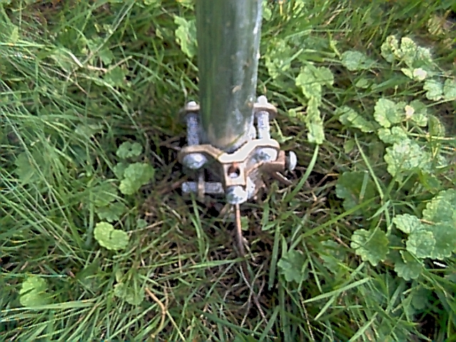 Three grounding clamps, copper wire attached to EMT, goes to rods.
